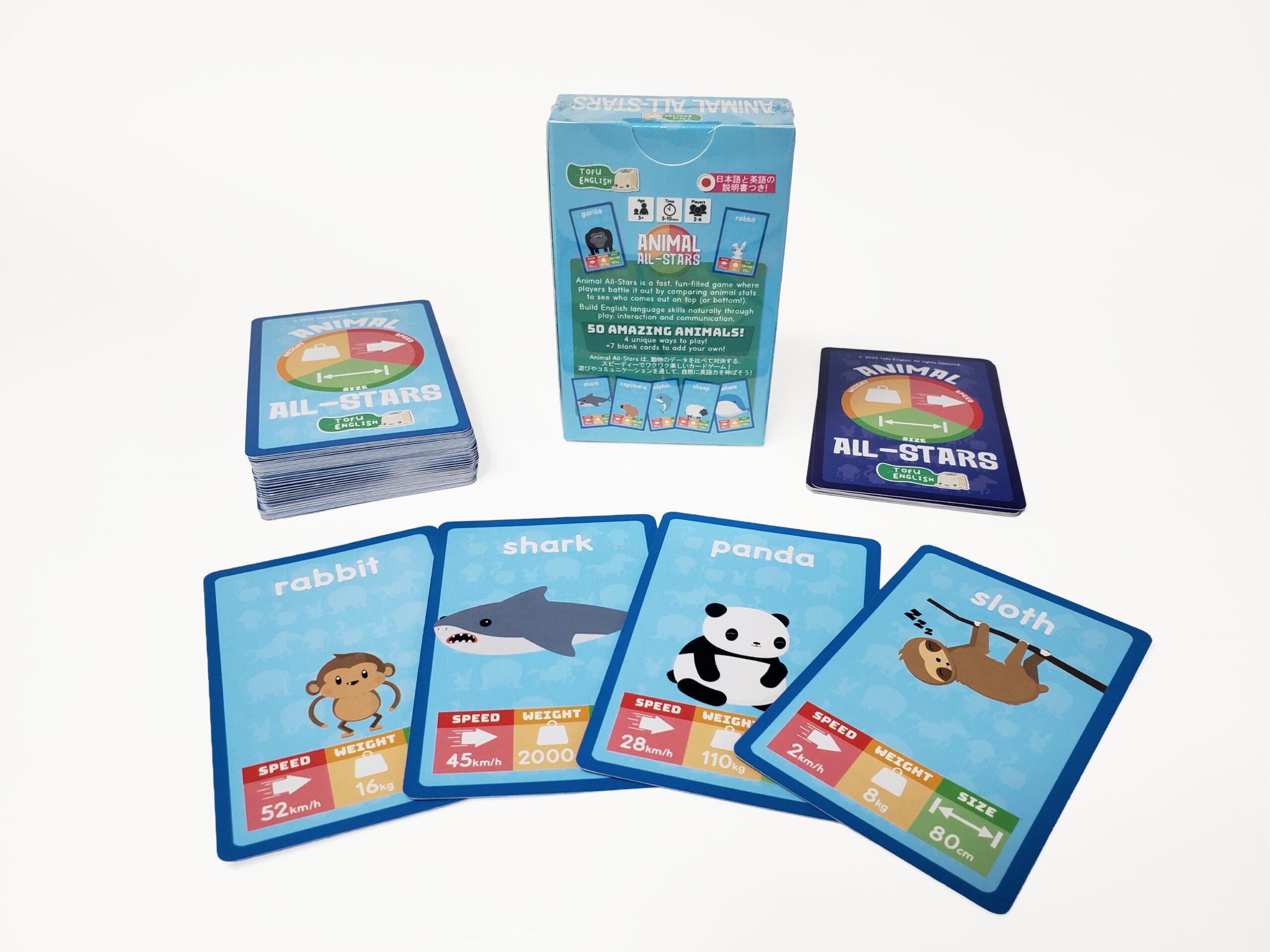 Animal All-Stars is a fast-paced, fun-filled card game where players compare real animal statistics to see who comes out on top (or bottom!). Using speed, size, and weight, players battle through rounds of comparison while building English skills naturally through play, interaction, and communication.
